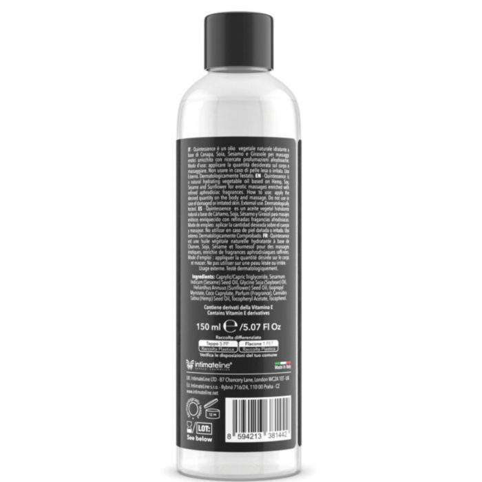 Quintessence Massage Oil, Nube de azúcar. Es un aceite natural y refinado para masajes, enriquecido con formulaciones exclusivas a base de aceites de alta calidad y esencias estimulantes cuidadosamente seleccionadas. Su fórmula nutritiva, elaborada con aceites vegetales completamente naturales, combinada con aromas sensuales, proporciona una hidratación intensa, dejando la piel suave y perfumada. Libre de parafina, el aceite Quintessence Massage Oil respetará y protegerá tu piel gracias a la presencia de aceite de semillas de cáñamo, estimulando tus sentidos con suaves notas de azúcar glas que te acompañarán durante todo el masaje, guiándote hacia la Quintessencia del placer.