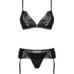 - un conjunto negro de tres piezas con sujetador, tanga y liguero